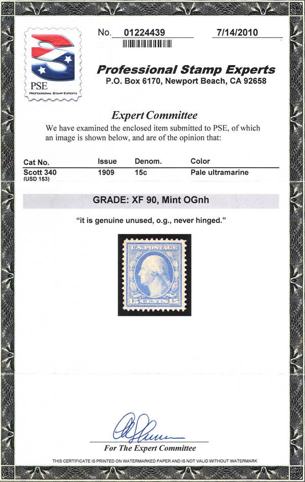 1909, 15¢ Washington, pale ultramarine, D.L. watermark (Scott 340), XF 90. Scott $160. SMQ $375.