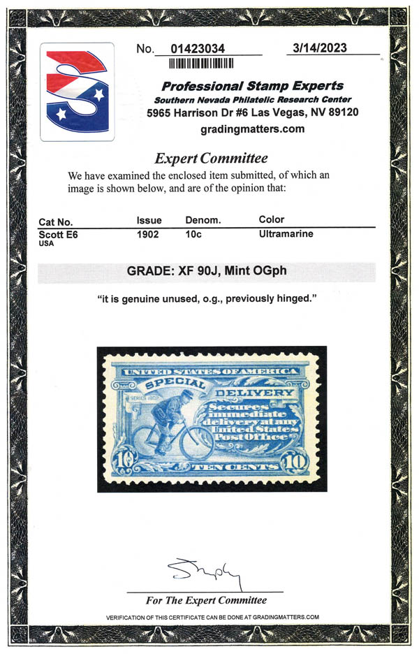 Special Delivery, 1902, 10¢ ultramarine (Scott E6), XF 90. Scott $240. SMQ $425.