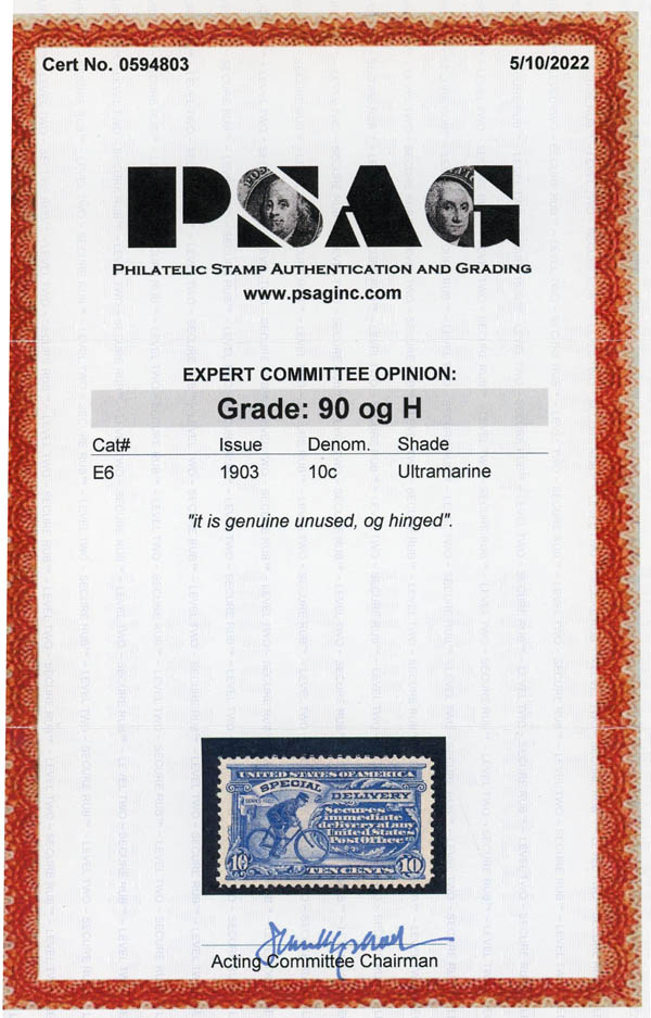 Special Delivery, 1902, 10¢ ultramarine (Scott E6), XF 90. Scott $240. SMQ $300.