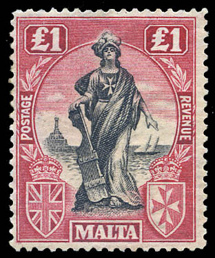 Los 358![]() ![]() Malta, 1922, Allegorical definitive, £1 black & carmine red, watermark sideways (SG 139. Scott 114a), Feinst. Catalog values are for hinged, never hinged carries a premium. SG £150 ($190). Scott $165. Estimate $80 - 120. |