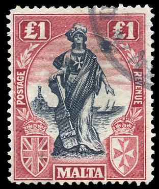 Malta, 1922, Allegorical definitive, £1 black & carmine red, watermark sideways (SG 139. Scott 114a), Feinst. SG £375 ($480). Scott $375.