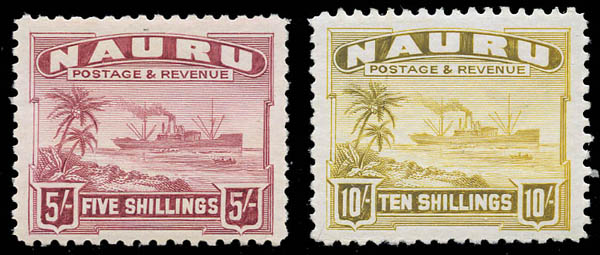 Nauru, 1937-48, Freighter, ½d to 10s complete, glazed surfaced white paper (SG 26B/39B. Scott 17a-30a), set of 14, Pracht. SG £225 ($290). Scott $255.