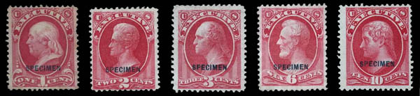 Executive Dept., 1875 Special Printings, 1¢-10¢ complete, overprinted "Specimen" (Scott O10SD-O14SD), Feinst. Scott $290.