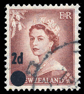 New Zealand, 1958, Queen Elizabeth II, 2d on 1½d brown lake, surcharged on wrong stamp (SG 763b. Scott 320), Feinst. SG £170 ($220). Scott $200.