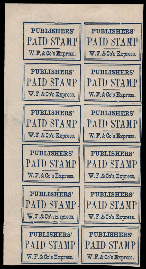 Wells Fargo & Co., Publishers' Stamp, 1876, blue (Scott 143LP10), Prachtstück im Aussehen. Scott $135+.