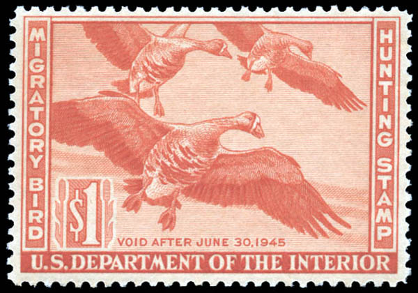 Hunting Permit, 1944, $1 White-Fronted Geese (Scott RW11), Kabinettstück. Scott $125.