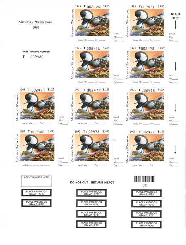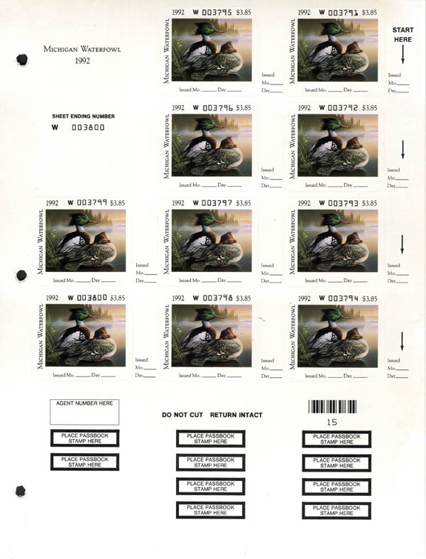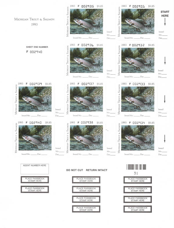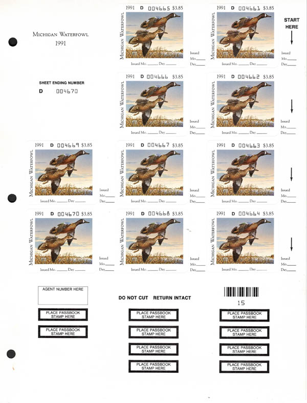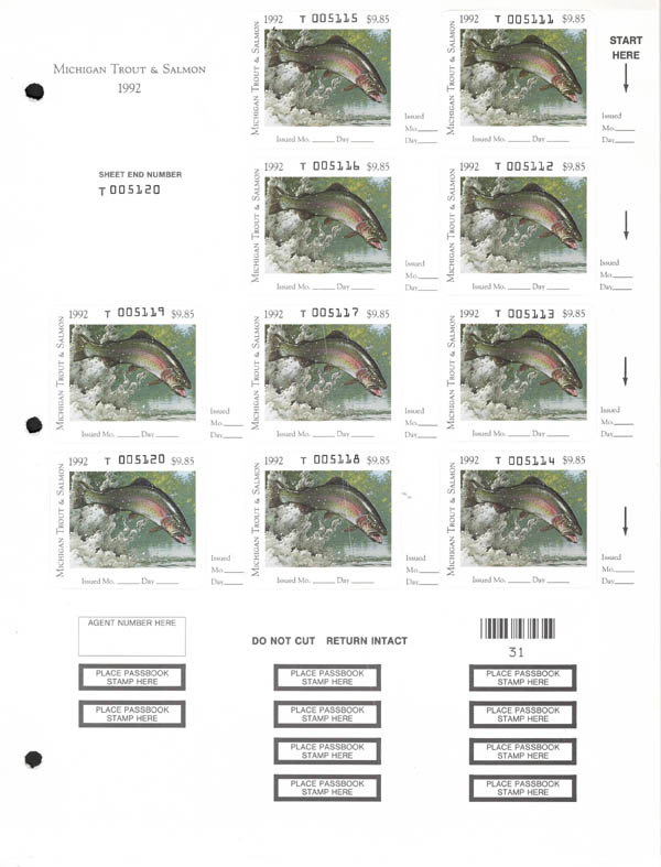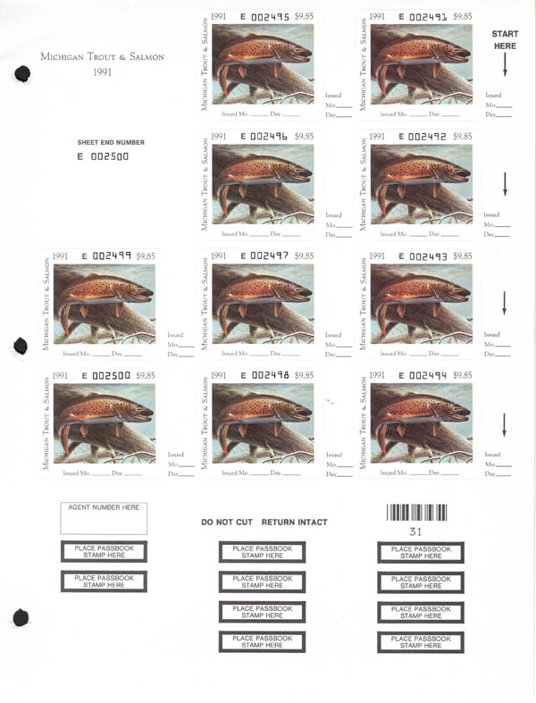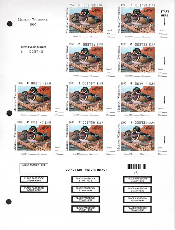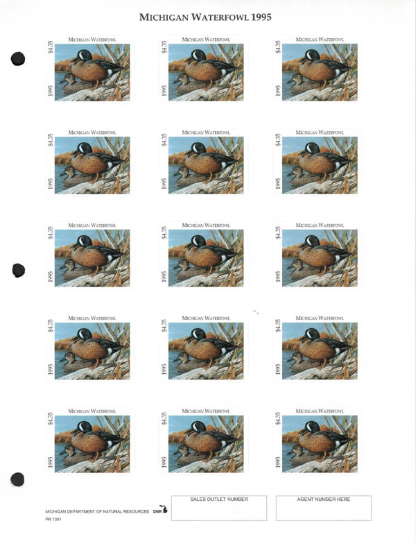 Michigan State Duck & Trout Stamps, 1990-95, full agent sheets, Pracht.