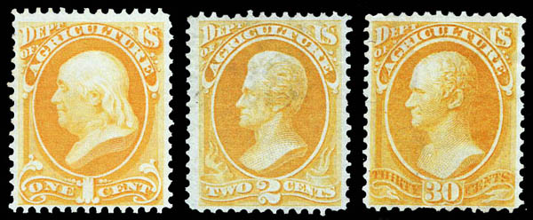 Agriculture Dept., 1873, 1¢, 2¢ and 30¢ yellow (Scott O1, O2, O9), Feinst. Scott $140.