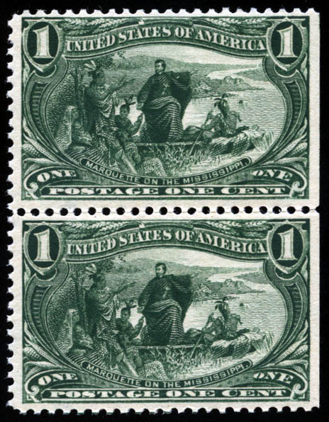 1898, Trans-Miss., 1¢ dark yellow green (Scott 285), vertical pair, fresh and well centered, o.g., never hinged; natural s.e. at right, Very Fine.