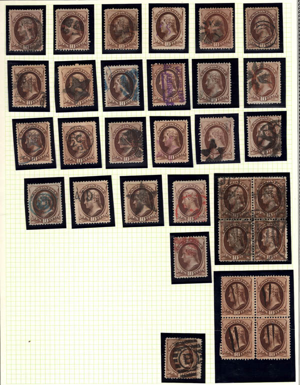 1879-82, 10¢ Jefferson, brown, A.B.N.C. printing, a cancellation study (Scott 187, 188, 209), Feinst.