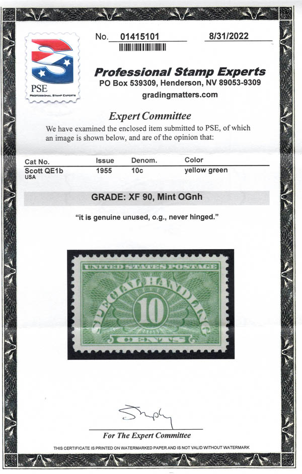 Special Handling, 1955, 10¢ light green, dry printing (Scott QE1b), XF 90. SMQ $35.