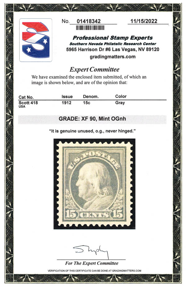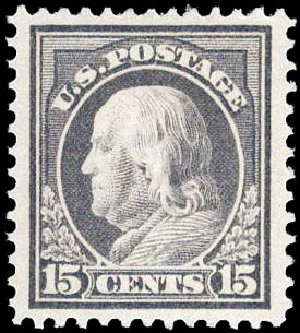 1912, 15¢ Franklin, gray, S.L. watermark, perf. 12 (Scott 418), XF 90. Scott $190. SMQ $350.