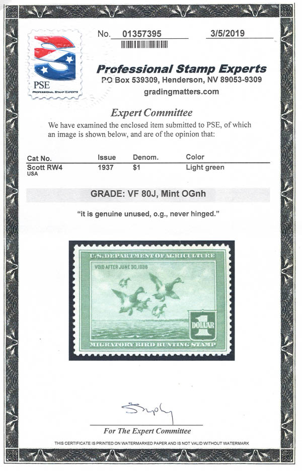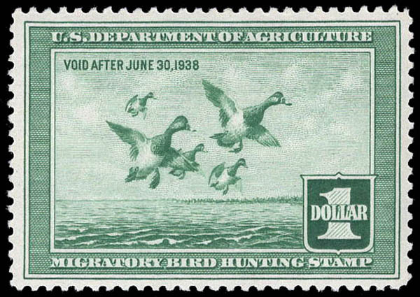 Federal Duck Stamp, 1937, $1 Scaup Ducks (Scott RW4), VF 80 J. Scott $300. SMQ $350.