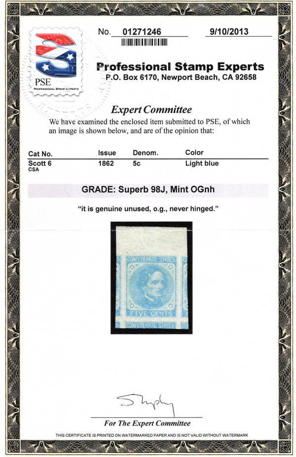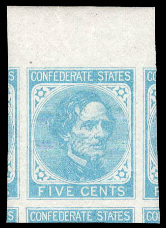 Confederacy, 1862, 5¢ Jefferson Davis, De La Rue printing, light blue (Scott 6), SUP 98 J. Scott $20. SMQ $100 for a 98.