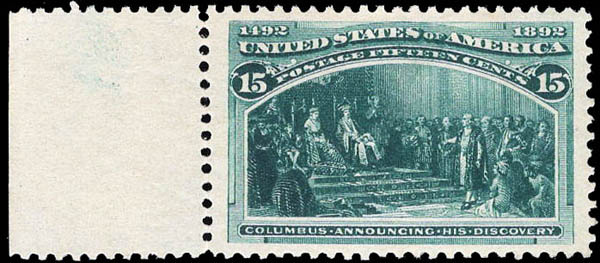 1893, 15¢ Columbian (Scott 238), VF-XF 85 J. Not priced by SMQ as 85J. SMQ is $275 for plain 85, $400 for XF 90. Scott $250.