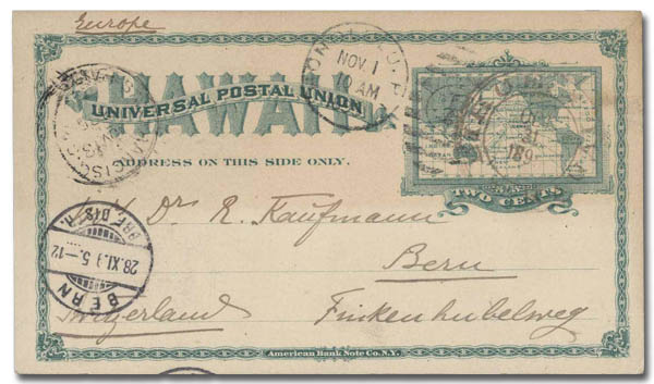 Hawaii, 1895, card from Lihue to Switzerland, Pracht. Scott UX9; $80+. Higgins and Gage 15.