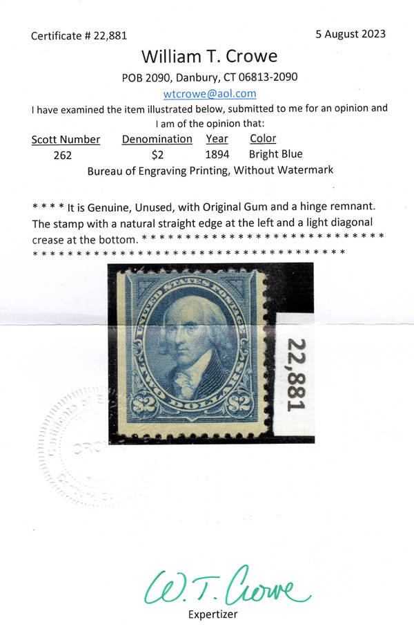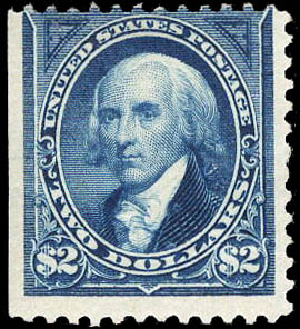 1894, $2 Madison, bright blue, unwatermarked (Scott 262), schlecht erhalten. Scott $2,750.