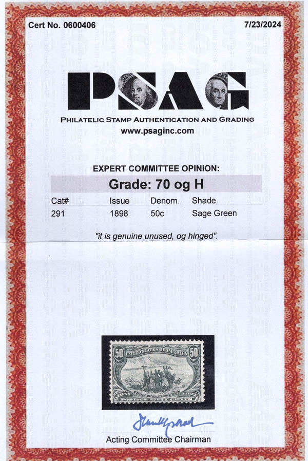 1898, 50¢ Trans-Miss. (Scott 291), Fein. Scott $600. SMQ $275. Scott Stamp Values $280.