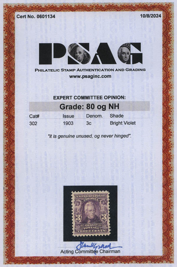 1903, 3¢ Jackson, bright violet (Scott 302), VF 80. Scott $140.