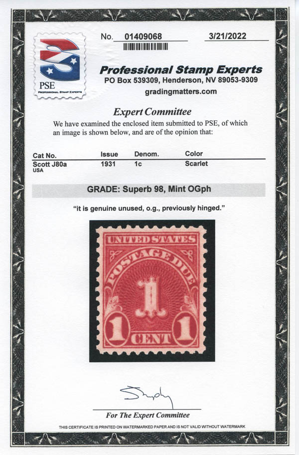 Postage Due, 1931, 1¢ scarlet, wet printing (Scott J80a), Luxus. SMQ $100.