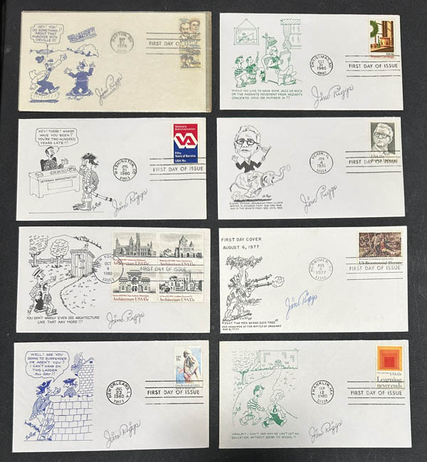 1977-81, a group of 16 first day covers with humorous cachets, signed "Jim Riggs", Pracht.
