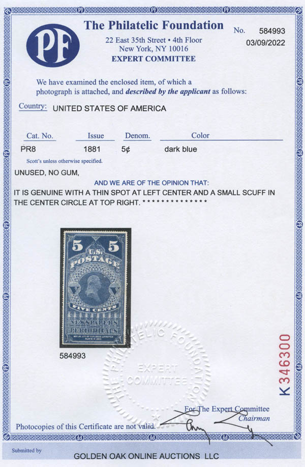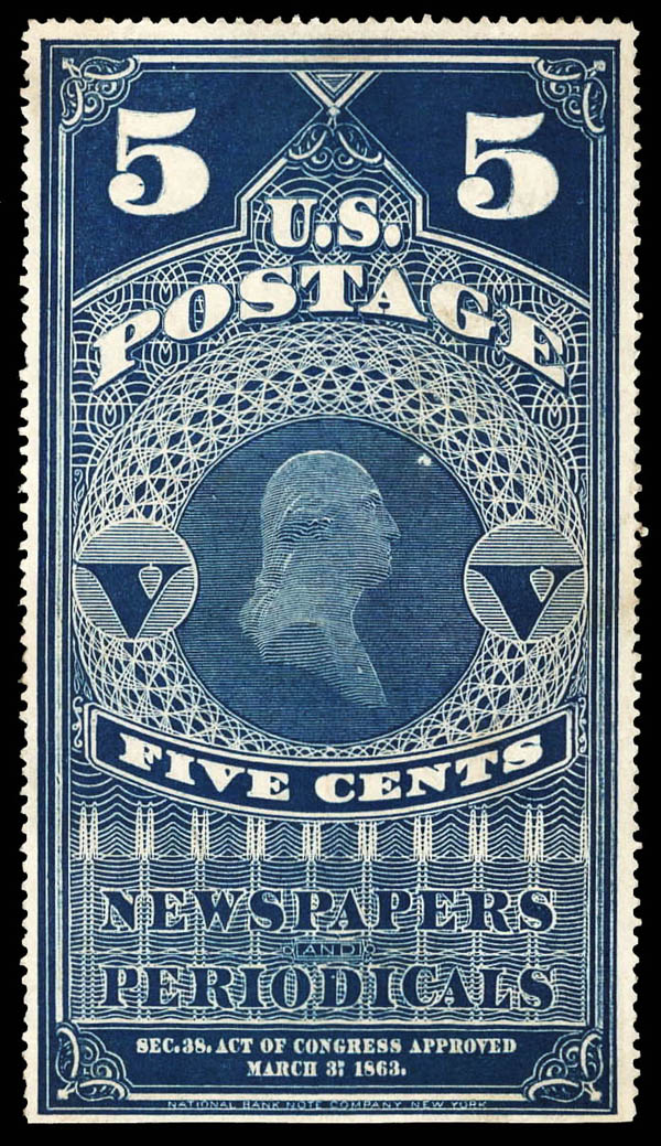 Newspaper, 1881, 5¢ dark blue, A.B.N.C. "Soft Paper" Reprint of the 1865 issue (Scott PR8), sonst Pracht. Scott $650.