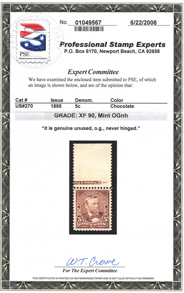 1895, 5¢ Grant, chocolate, D.L. watermark (Scott 270), XF 90. Scott $105. SMQ $275.