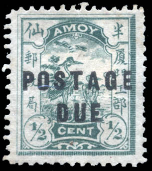 China: Treaty Ports: Amoy, Postage Due, 1895, ½¢ green, black overprint, "Due" shifted to right (Scott J6c), Pracht. Scott $400. Chan LAD6a.