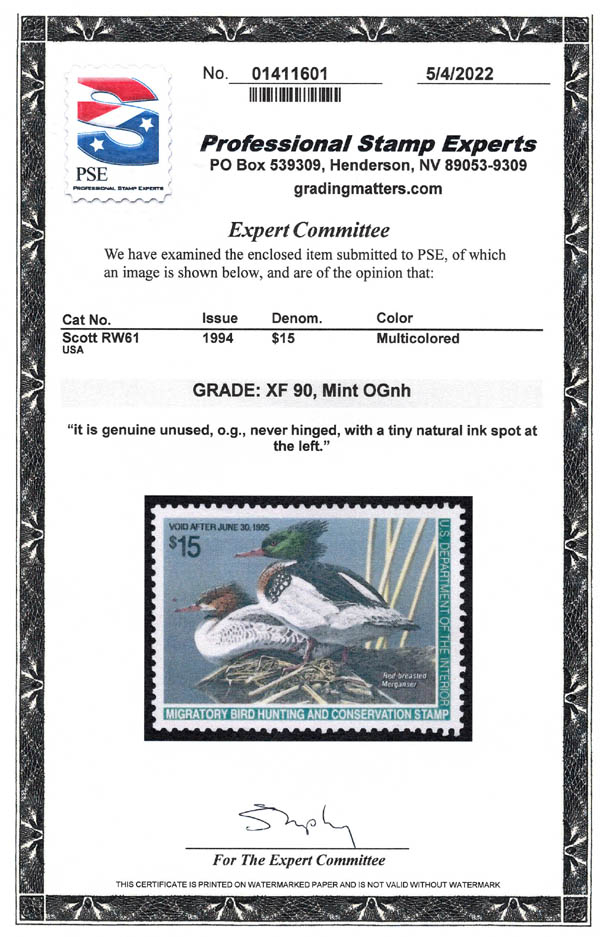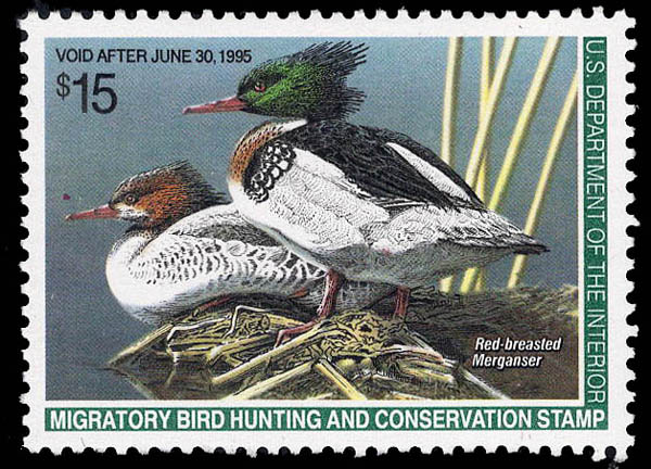 Hunting Permit, 1994, $15 Mergansers (Scott RW61), Kabinettstück. SMQ $45.