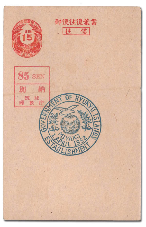 Ryukyus, Paid Reply Postal Card, 1951, 85s typographed surcharge type "f" on 15s vermilion on tan, message card (Scott UY5h), CC-6 scenic cachet, Very Fine.