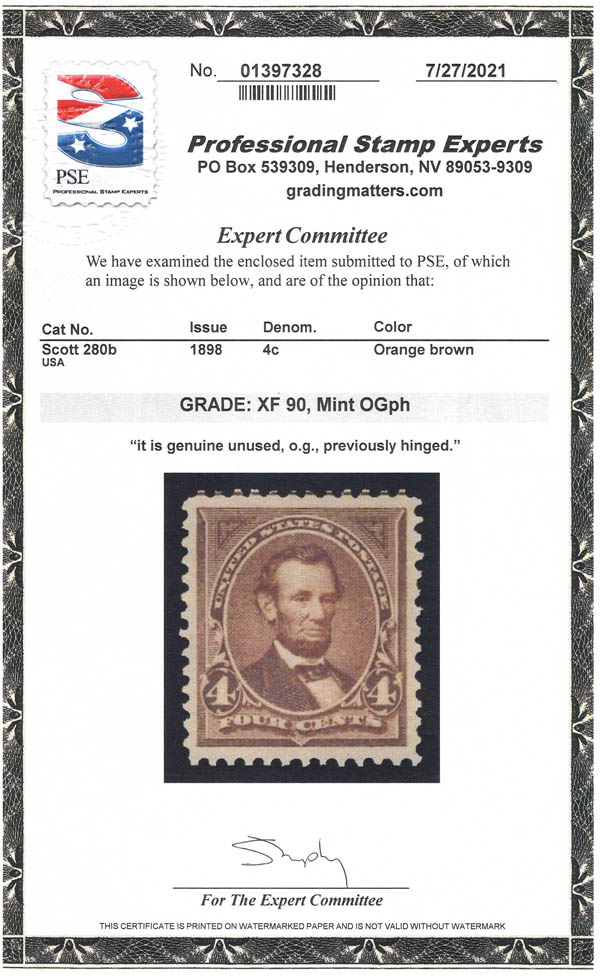 1898, 4¢ Lincoln, orange brown (Scott 280b), XF 90. Scott $30. SMQ $60.