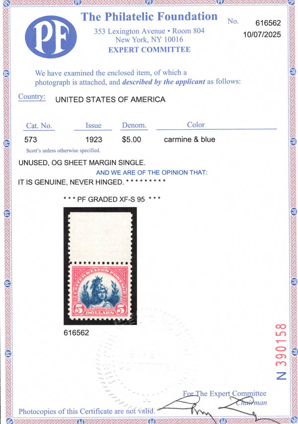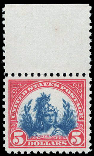 1923, $5 America (Scott 573), XF-SUP 95. Scott $180. SMQ $425. Scott Stamp Values $475.