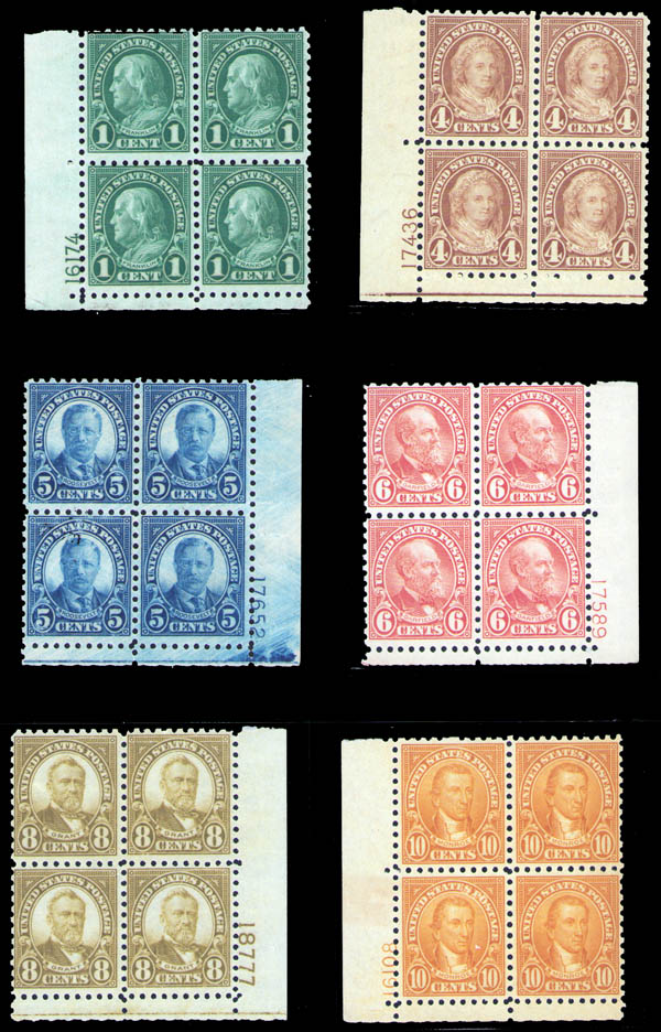 1923, rotary press printings, perf. 10, 1¢ to 10¢ (Scott 581, 585-587, 589, 591), a group of 6 plate blocks of 4, Feinst. Scott $2,600.