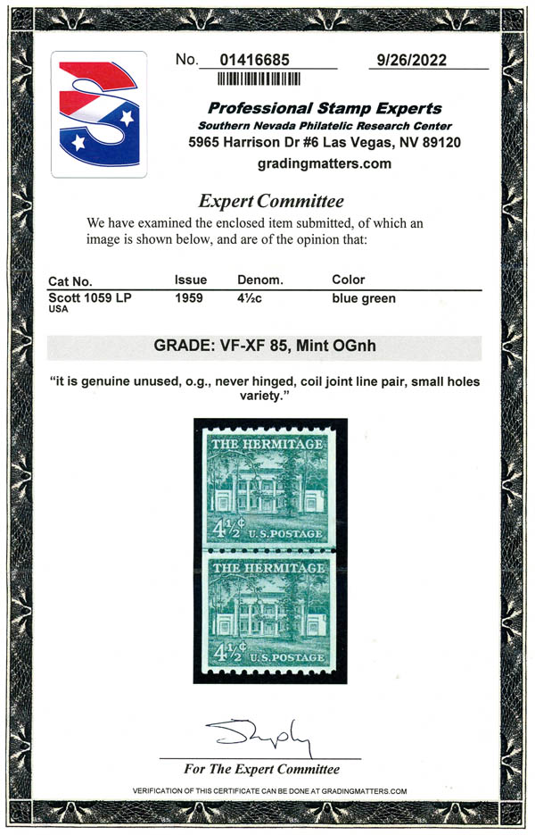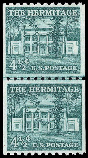 1959, Liberty Issue, 4½¢ Hermitage, vertical coil, small perf. holes (Scott 1059 var.), VF-XF 85. Scott $450.