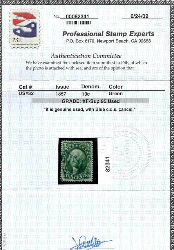 Lote 10 o 1857, 10¢ Washington, green, type II (Scott 32), impecable centering and radiant color, blue c.d.s. cancel, Extremely Fine to Superb, with 2002 P.S.E. certificate graded XF-SUP 95. Scott $190. SMQ $2,750. Estimate $2,000 - 3,000 Only 2 graded higher in P.S.E.'s Population Report. |