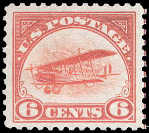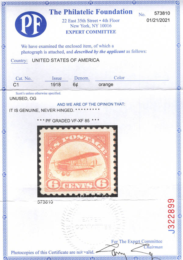 Airmail, 1918, 6¢ Jenny (Scott C1), o.g., never hinged, Very Fine to Extremely Fine, with 2021 P.F. certificate graded VF-XF 85. Scott $110. SMQ $125. Scott Stamp Values $130.