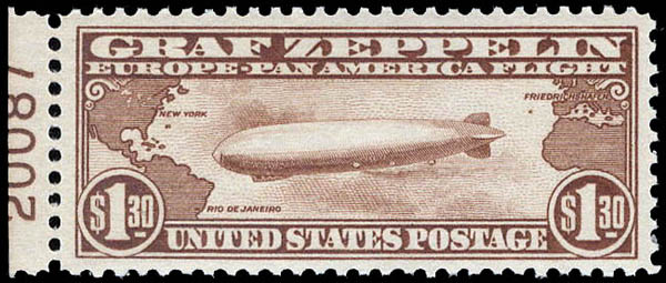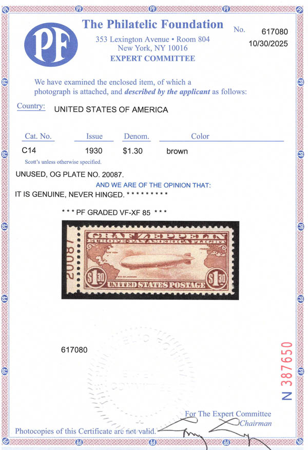 Lote 1035![]() ![]() Airmail, 1930, $1.30 Graf Zeppelin (Scott C14), plate number single, lovely centering, o.g., never hinged, Very Fine to Extremely Fine, with 2025 P.F. certificate graded VF-XF 85. Scott $575. SMQ $600. Scott Stamp Values $625. Estimate $400 - 600. |