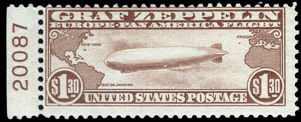 Airmail, 1930, $1.30 Graf Zeppelin (Scott C14), plate number single, o.g., lightly hinged, nearly Fine. Scott $375.