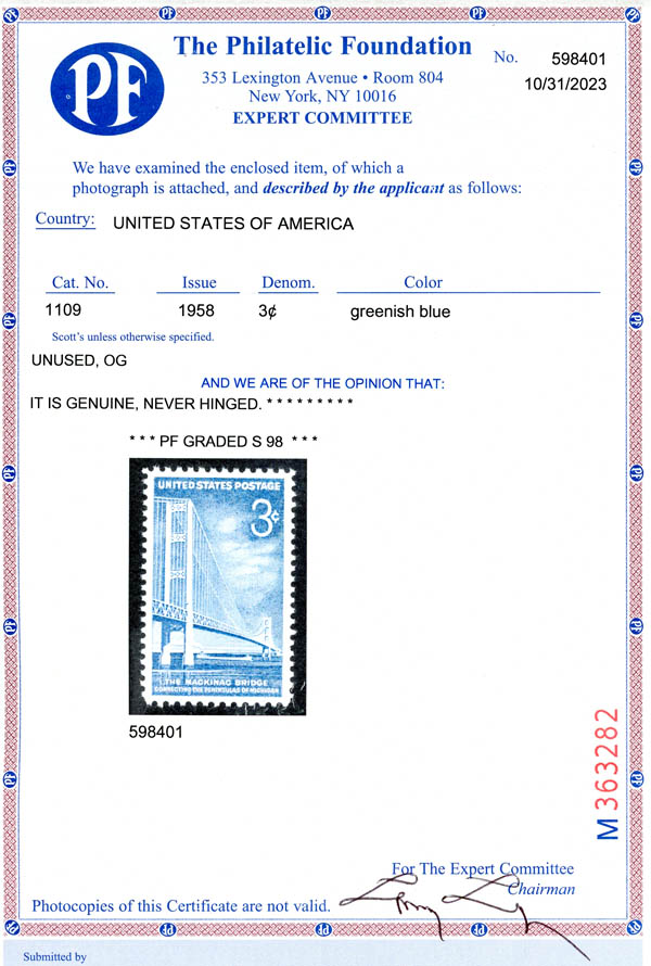 1958, 3¢ Mackinac Bridge (Scott 1109), o.g., never hinged, Superb, with 2023 P.F. certificate graded SUP 98. SMQ $60.