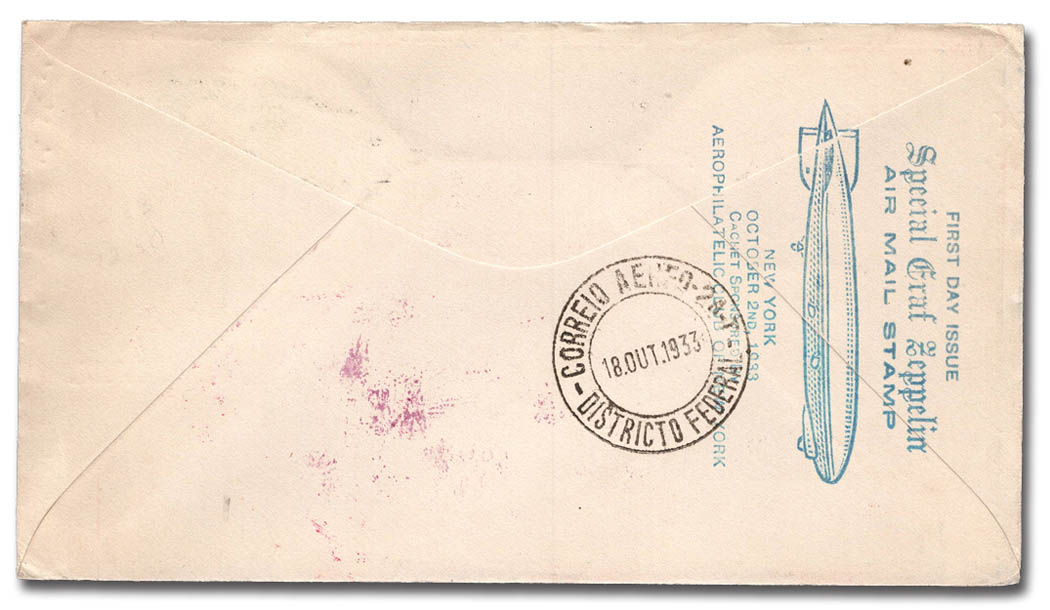 Lote 1042![]() Airmail, 1933, 50¢ "Chicago" Zeppelin (Scott C18), used on a colorful First Day Cover dated October 2, 1933, and carried on a flown South America Flight via Pernambuco, Brazil, with all proper postmarks and cachets, Extremely Fine. Scott $200. Estimate $150 - 200. |