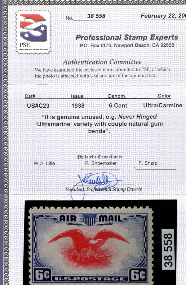 Airmail, 1938, 6¢ Eagle, ultramarine & carmine color error (Scott C23c), o.g., never hinged (natural gum bends), Fine to Very Fine, with 2000 P.S.E. certificate. Scott $350.