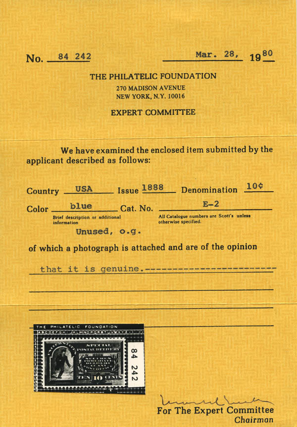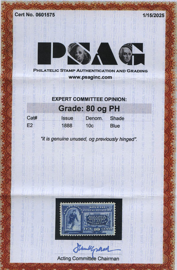 Lote 1057![]() Special Delivery, 1888, 10¢ blue (Scott E2), fresh and well centered, o.g., lightly hinged, Very Fine, with 1980 P.F. and 2025 P.S.A.G. certificates, the latter graded VF 80. Scott $500. Estimate $350 - 500. |