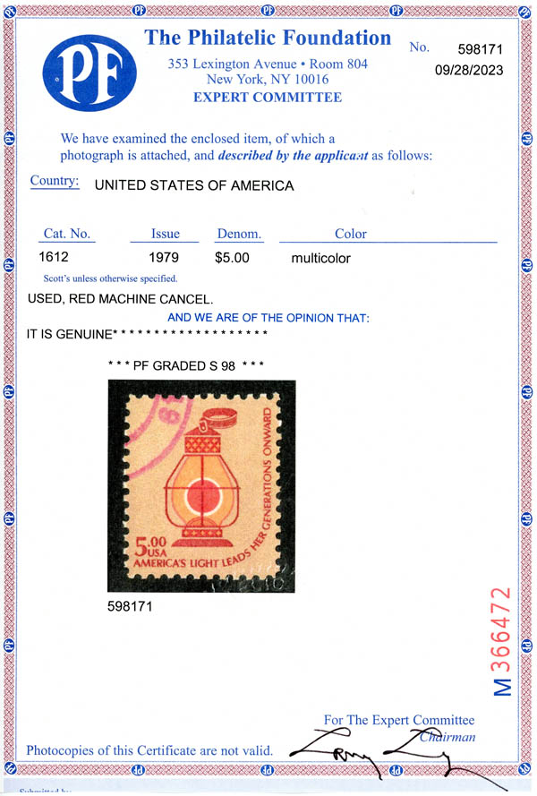 1979, $5 Lantern (Scott 1612), red machine cancel, Superb, with 2023 P.F. certificate graded SUP 98.