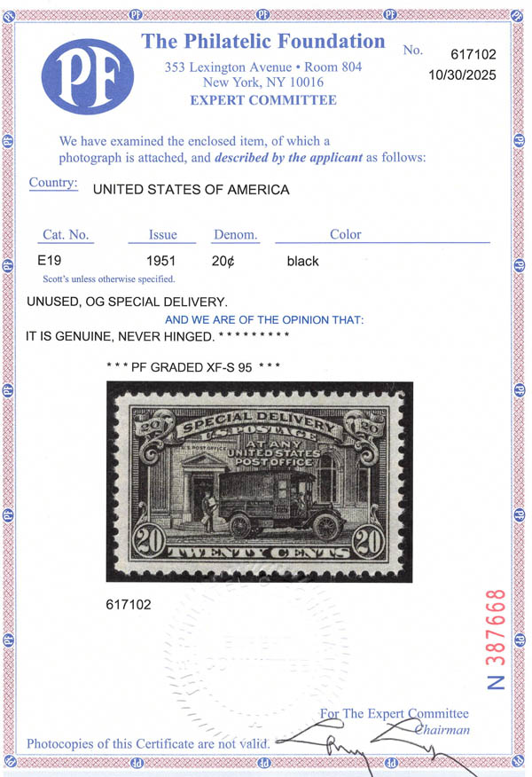 Special Delivery, 1951, 20¢ black (Scott E19), o.g., never hinged, Superb, with 2025 P.F. certificate graded SUP 98. SMQ $110.