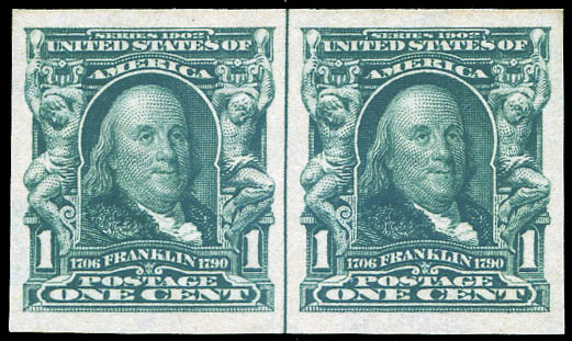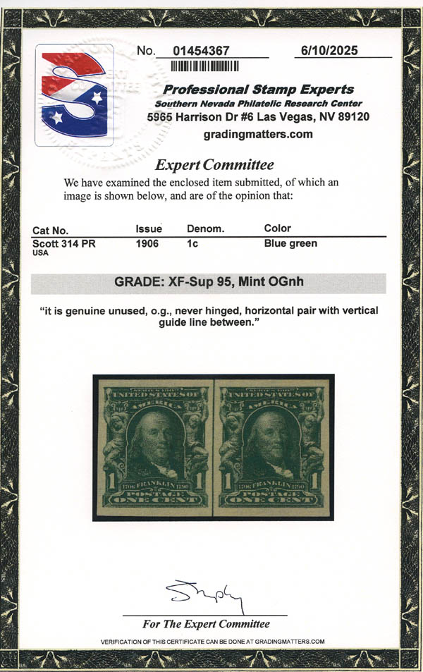 Lote 112![]() ![]() 1906, 1¢ Franklin, blue green, imperf. (Scott 314), pair with vertical guide line between, o.g., never hinged, Extremely Fine to Superb, with 2025 P.S.E. certificate graded XF-SUP 95. Scott $28. SMQ $150. Estimate $100 - 150. |