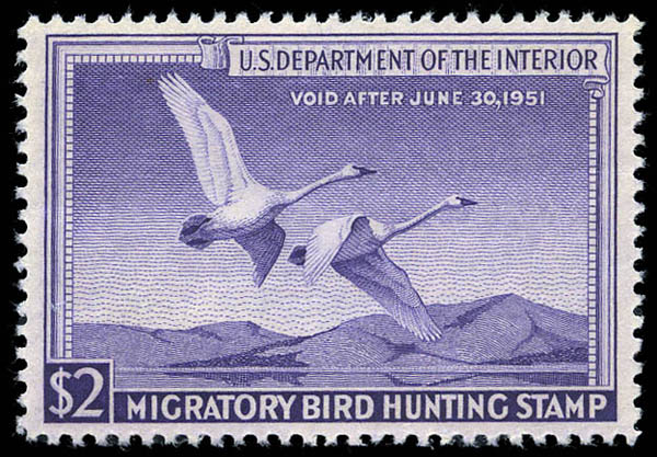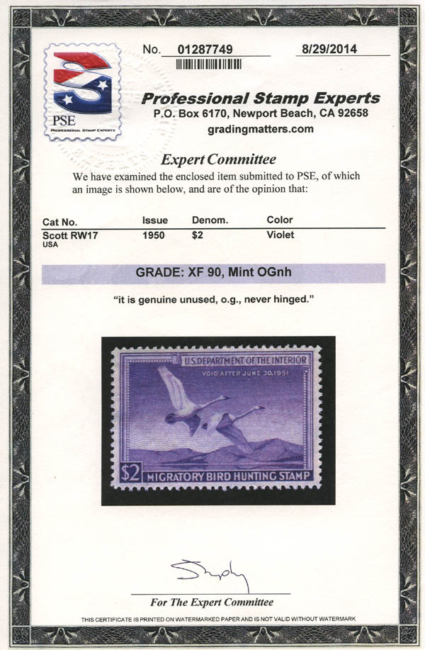 Federal Duck Stamp, 1950, $2 Trumpeter Swans (Scott RW17), o.g., never hinged, Extremely Fine and choice, with 2014 P.S.E. certificate graded XF 90. Scott $90. SMQ $160.