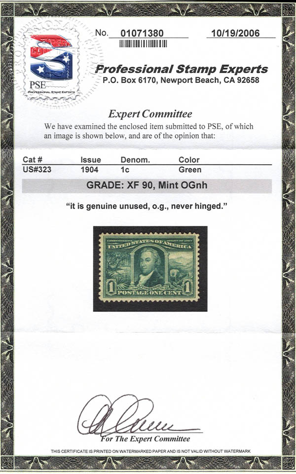 1904, 1¢ Louisiana Purchase (Scott 323), well centered with wide margins, o.g., never hinged, Extremely Fine, with 2006 P.S.E. certificate graded XF 90. Scott $60. SMQ $250.