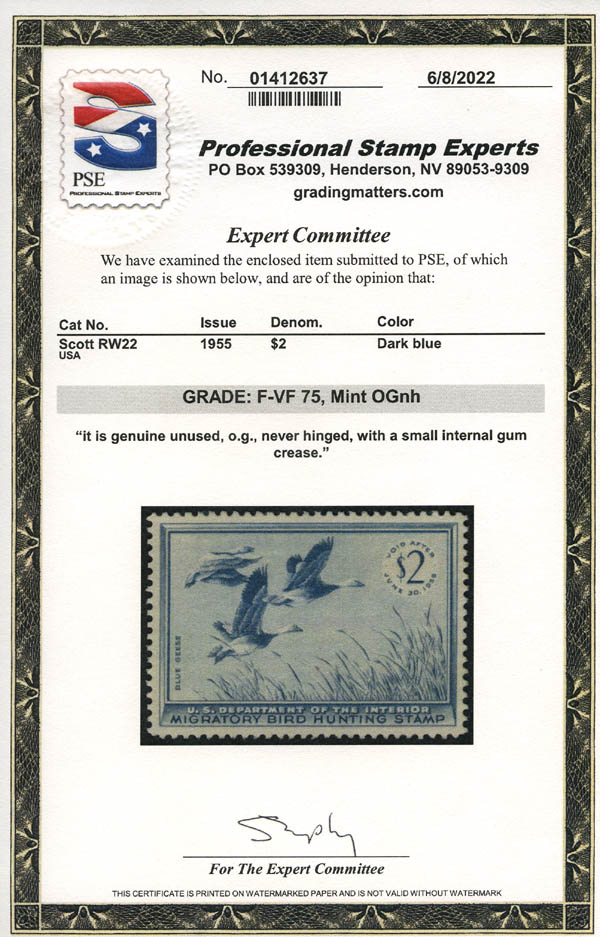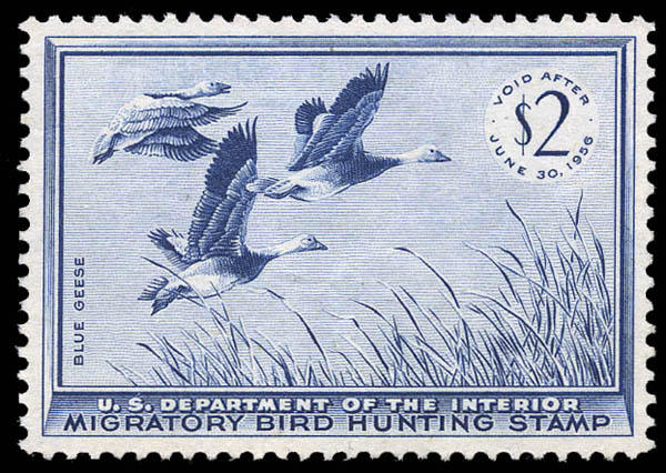 Lote 1180![]() ![]() Federal Duck Stamp, 1955, $2 Blue Geese (Scott RW22), near perfect centering, o.g., never hinged, a small gum crease, Fine to Very Fine overall, with 2023 P.S.E. certificate. Scott $85. Estimate $40 - 60. |
