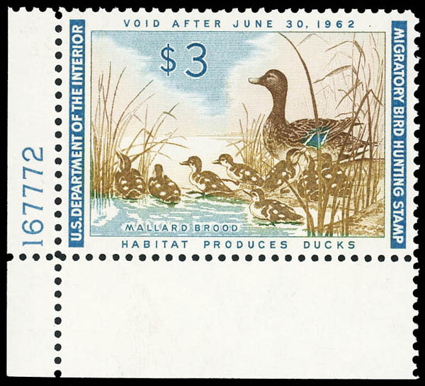 Lote 1182![]() ![]() Federal Duck Stamp, 1961, $3 Mallards (Scott RW28), a wonderfully choice plate number single, o.g., never hinged, Superb, with 2006 P.S.E. certificate graded SUP 98. Scott $95. SMQ $350. Estimate $250 - 350. |