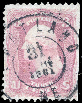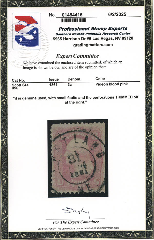 Lote 12 o 1861, 3¢ Washington, pigeon blood pink (Scott 64a), fresh true color and nicely centered; small faults and perfs trimmed at right, otherwise Fine to Very Fine, with 2025 P.S.E. certificate. Scott $4,500. Estimate $600 - 800. |